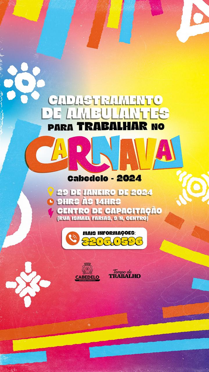 A Prefeitura Municipal de Cabedelo (PMC), por meio da Secretaria de Indústria, Comércio e Portos (SEICOP), inicia, na segunda-feira (29), o cadastro de ambulantes interessados em trabalhar durante as festividade de Carnaval na cidade, que acontecem entre os dias 04 e 13 de fevereiro.