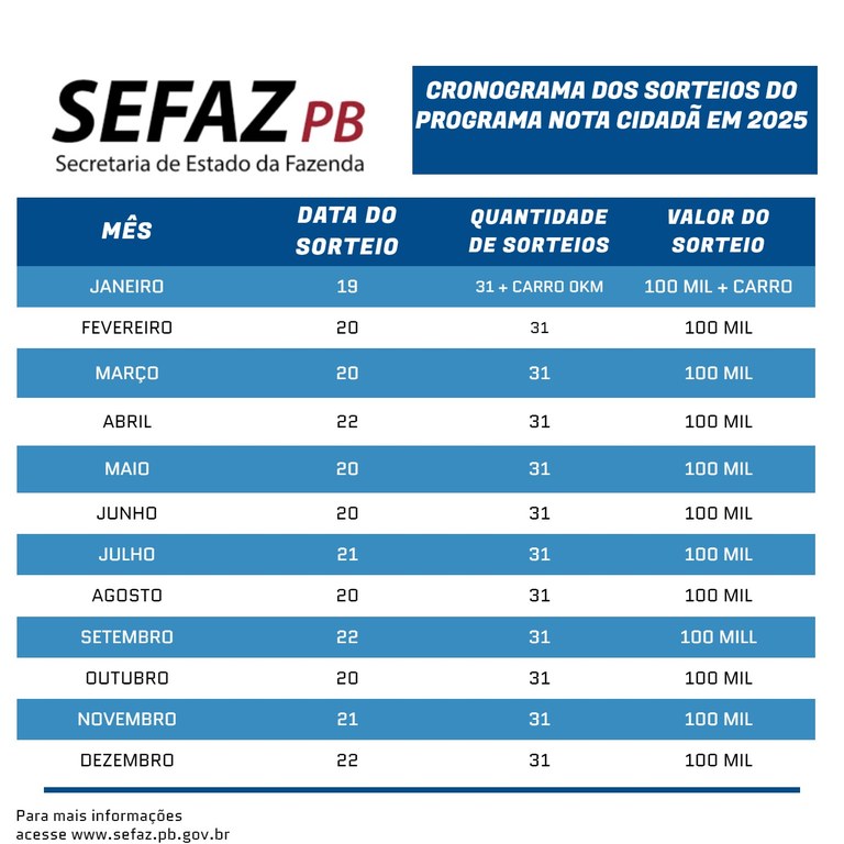 A Secretaria de Estado da Fazenda (Sefaz-PB) publicou, no Diário Oficial Eletrônico (Doe-Sefaz) desta sexta-feira (3), o cronograma de sorteios do Programa Nota Cidadã em 2025. Serão mais uma vez doze sorteios este ano com um total de R$ 1,2 milhão em prêmios em dinheiro e o prêmio especial de um carro zero quilômetro.