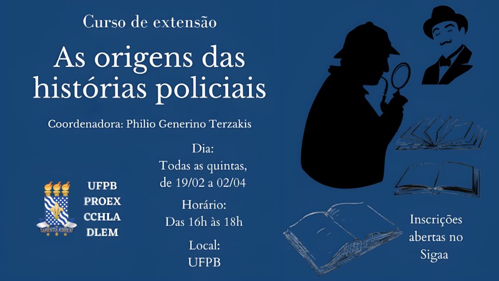 A Universidade Federal da Paraíba (UFPB) inscreve até o próximo dia 18 para o curso de extensão “As origens das histórias policiais”, com oferta de 30 vagas e carga horária de 15 horas. As aulas ocorrem, presencialmente, às quintas-feiras, das 16h às 18h, no campus I da UFPB, em João Pessoa, e vão do dia 19 de fevereiro até o dia 2 de abril.