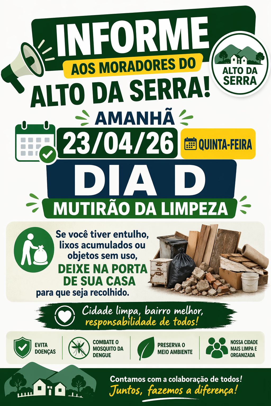 A gestão municipal ressalta que a participação da população é indispensável para o sucesso da ação. A proposta é que, com o engajamento de todos, seja possível construir um ambiente mais limpo, saudável e organizado para toda a população.