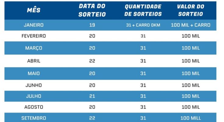A Secretaria de Estado da Fazenda (Sefaz-PB) publicou, no Diário Oficial Eletrônico (Doe-Sefaz) desta sexta-feira (3), o cronograma de sorteios do Programa Nota Cidadã em 2025. Serão mais uma vez doze sorteios este ano com um total de R$ 1,2 milhão em prêmios em dinheiro e o prêmio especial de um carro zero quilômetro.