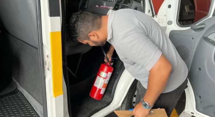 Itens – Durante a inspeção são observados itens de segurança, equipamentos obrigatórios, bem como higiene e conforto, sendo: faroletes e sinaleiras, bancos, forros, funilaria e pintura, tacógrafo, extintor, pneus, cintos de segurança, trava das portas, buzina, para-brisas e outros, checando no total 40 itens do veículo. Também é verificado se as faixas laterais e traseiras estão de acordo com as normas que regulamentam o serviço de transporte escolares.