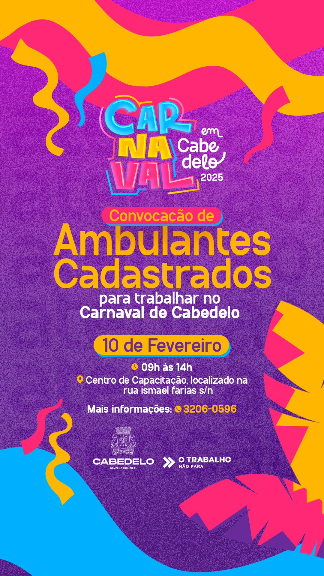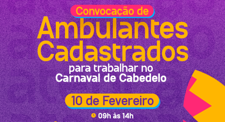 A Prefeitura Municipal de Cabedelo (PMC), por meio da Secretaria de Desenvolvimento Econômico e Portos (Sedep), inicia, na segunda-feira (10), a inscrição de ambulantes interessados em trabalhar durante as festividade de Carnaval na cidade, que acontecem entre os dias 28 de fevereiro e 08 de março.