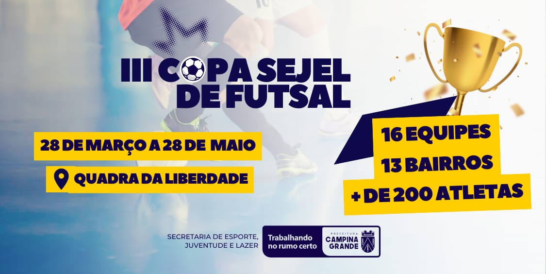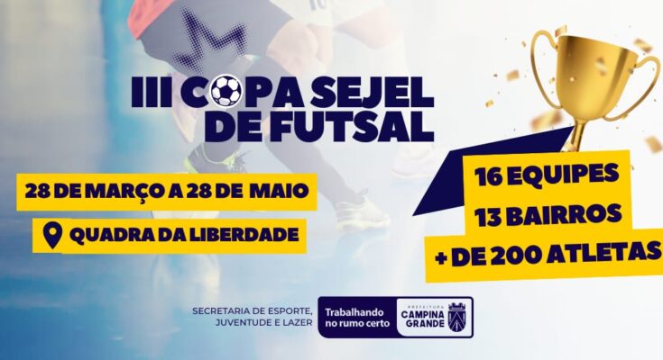 A Prefeitura de Campina Grande, através da Secretaria de Esporte, Juventude e Lazer (Sejel), promove, a partir desta sexta-feira (28), a terceira edição da Copa Sejel de Futsal Masculino. As disputas envolverão mais de 200 atletas e acontecerão no Ginásio Evonilson Menezes, mais conhecido como a Quadra da Liberdade.