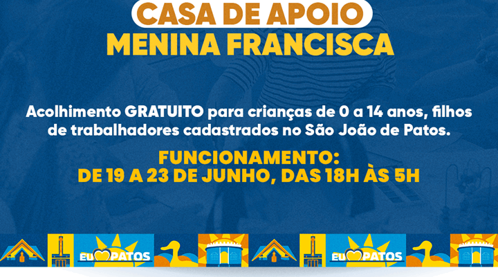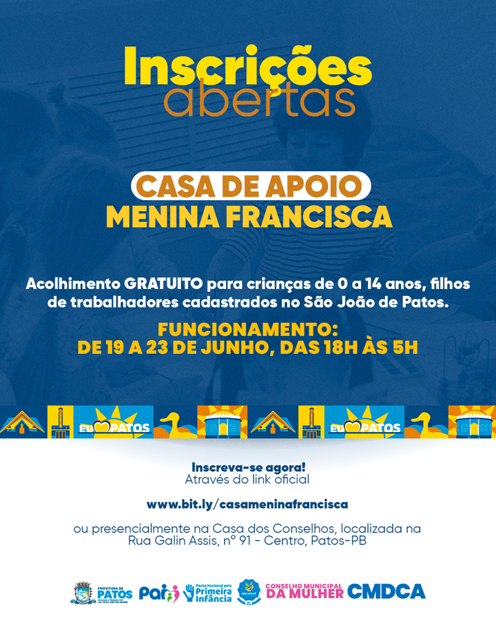 Prefeitura de Patos informa que a Casa de Apoio Menina Francisca está com inscrições abertas para o acolhimento de crianças durante o São João é da Gente 2025. A iniciativa é voltada para filhos de trabalhadores cadastrados oficialmente para atuar no evento, garantindo um ambiente seguro e acolhedor para crianças de 0 a 14 anos.