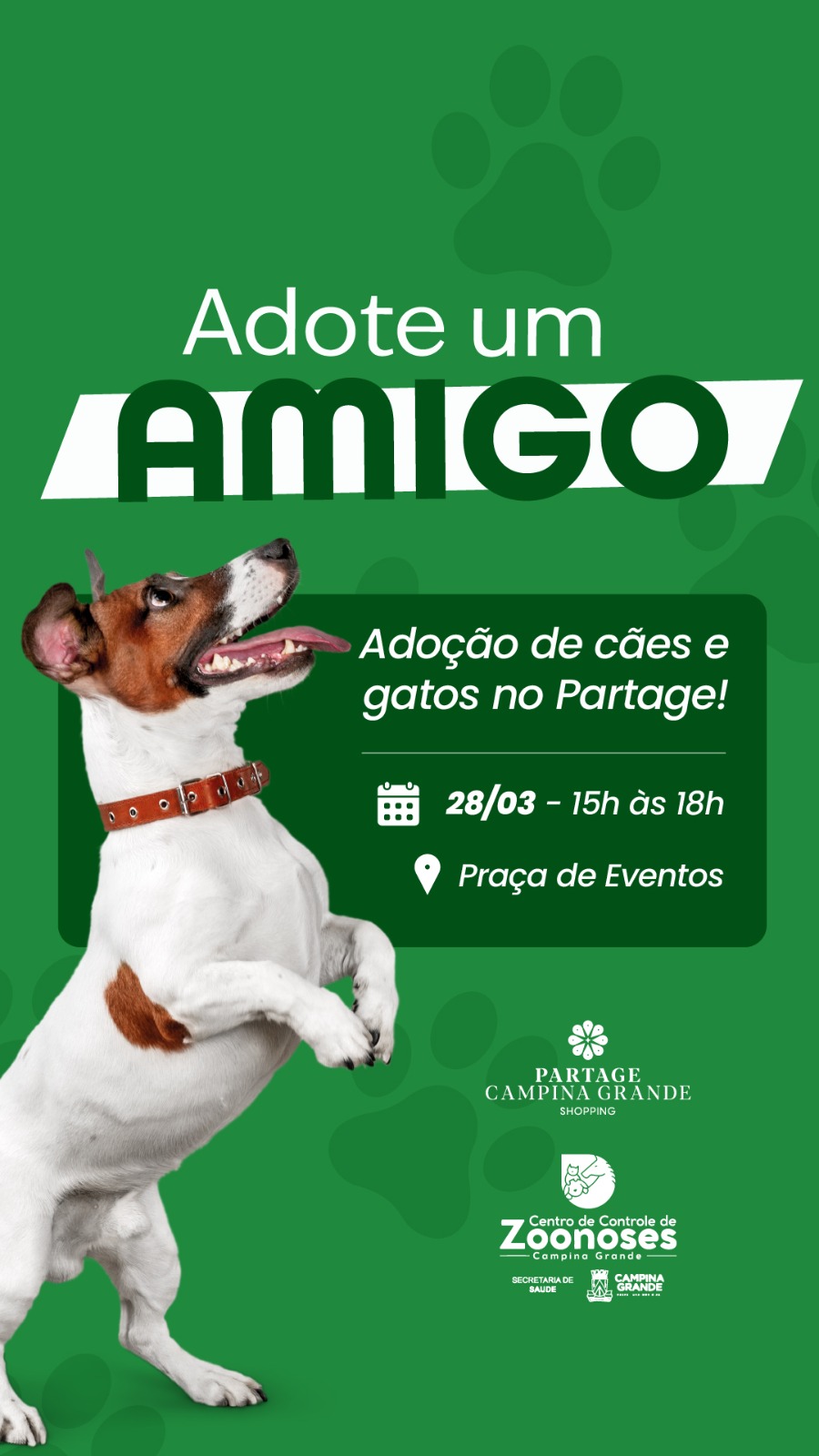 O Centro de Controle de Zoonoses (CCZ) de Campina Grande realiza, neste sábado, 28, um evento de adoção responsável em parceria com o Partage Shopping. A ação acontecerá das, 15h às 18h, na praça de eventos do shopping, com o objetivo de incentivar a adoção consciente e proporcionar um novo lar para animais resgatados.